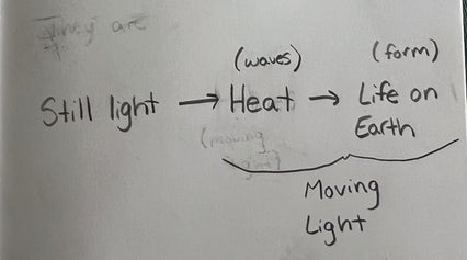 In this way, we can see Earth and her inhabitants as the sum of all that came before it. For example, from each adult hueman we can track back to adolescence, to a toddler, to a baby, to a fetus, to the cells, to the atoms, to the particles of an atom (protons and electrons), to the photon (light particle), to the light wave, to the sun's inner still light, to the love that created the sun to warm the cold of space.